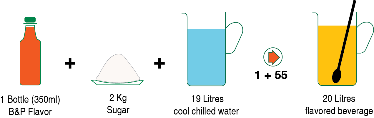 Preparation of Beverage Mix 1 part of flavored drink base with 55 parts of cool chilled syrup water or dilute according to your desired taste.
